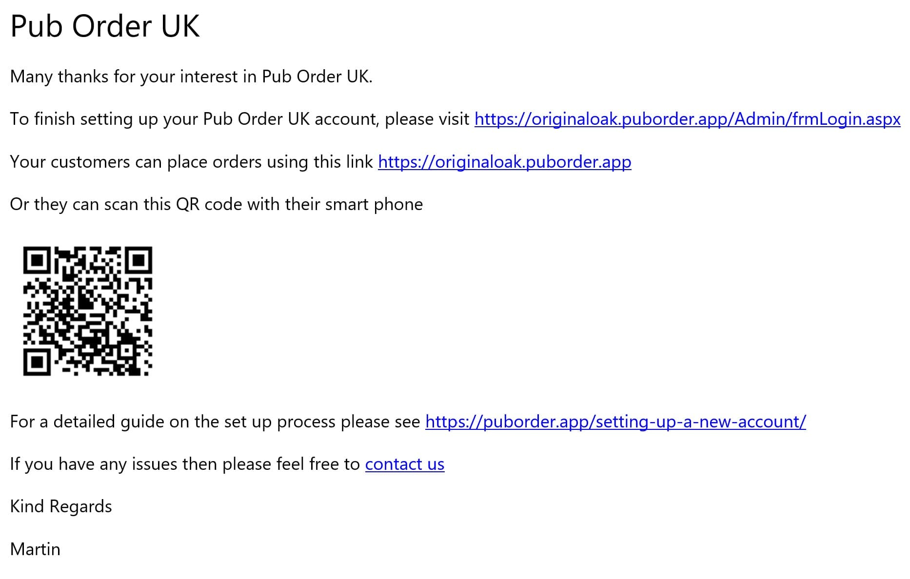 It also has a QR code that you can print off so that your customers can scan to go directly to the pub order app.